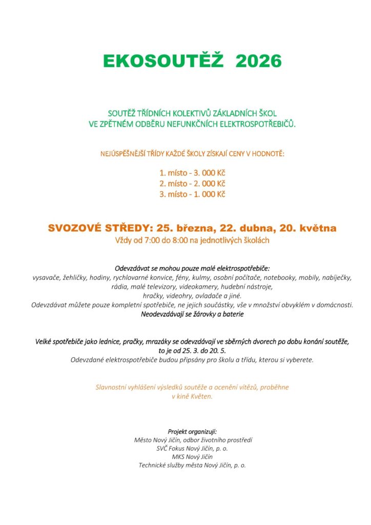 Středisko volného času FOKUS ve spolupráci s městem a Technickými službami města Nového Jičína odstartovalo letošní ročník soutěže školních kolektivů ve sběru drobných, ale i větších vysloužilých elektrických spotřebičů z domácností.